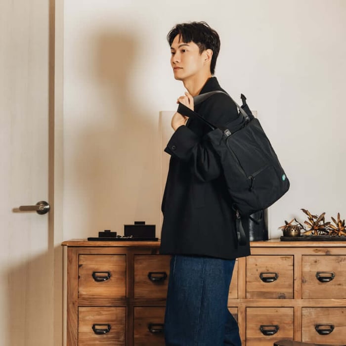 這款包最厲害的地方在於它的「變形機能」。平時收納狀態下是俐落的 28L 通勤包,看起來輕盈不笨重;一旦開啟擴充拉鍊,瞬間釋放 10L 的隱藏空間。