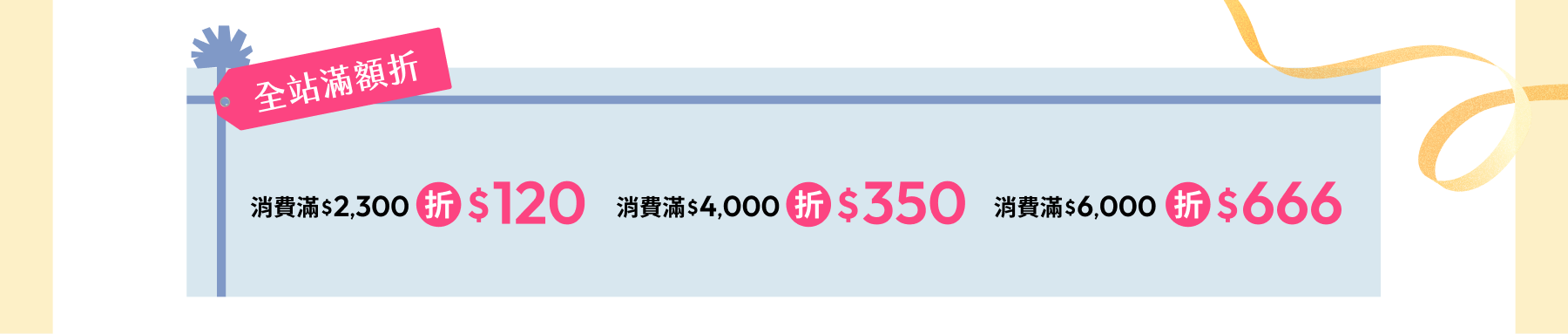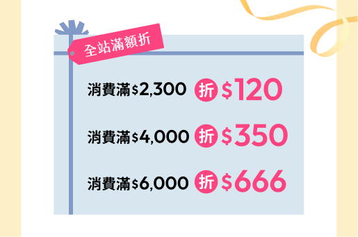 - 【全站滿額折】 消費滿 $2,300 折 $120、滿 $4,000 折 $350、滿 $6,000 折 $666,活動不累折。