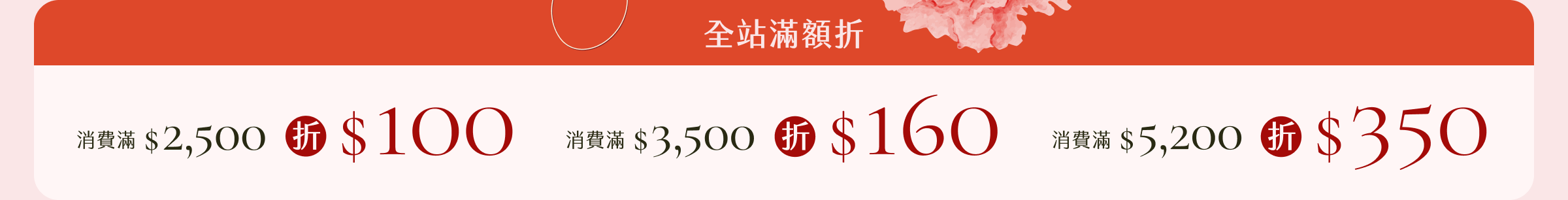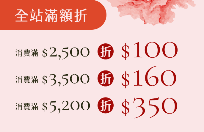 - 【全站滿額折】 消費滿 $2,500 折 $100、滿 $3,500 折 $160、滿 $5,200 折 $350,活動不累折。