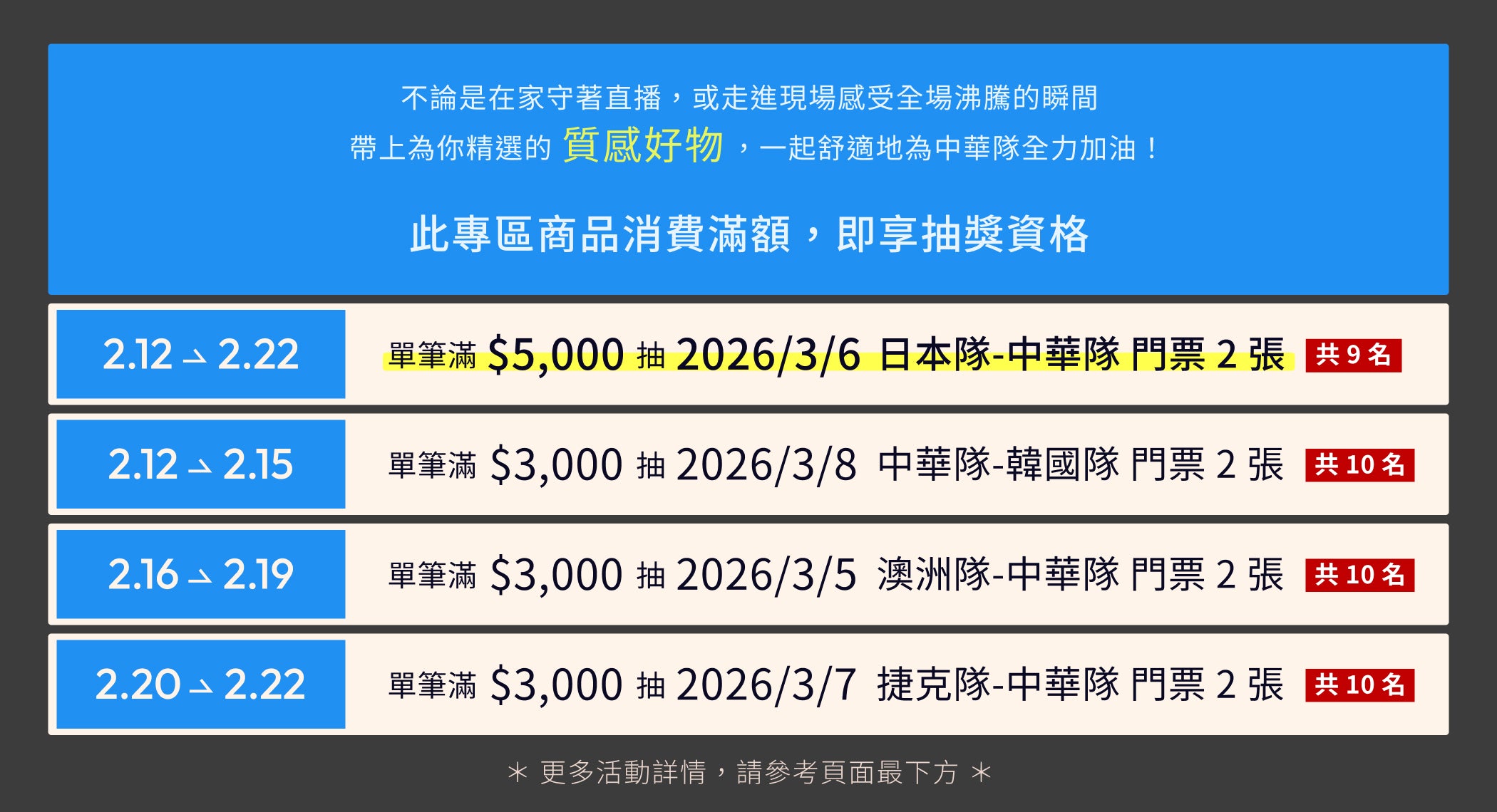 2/12 - 2/22 期間於專區商品單筆消費金額達新台幣 5,000 元(含)以上,即享抽 2026/3/6 日本隊-中華隊 門票兩張之資格乙次。
