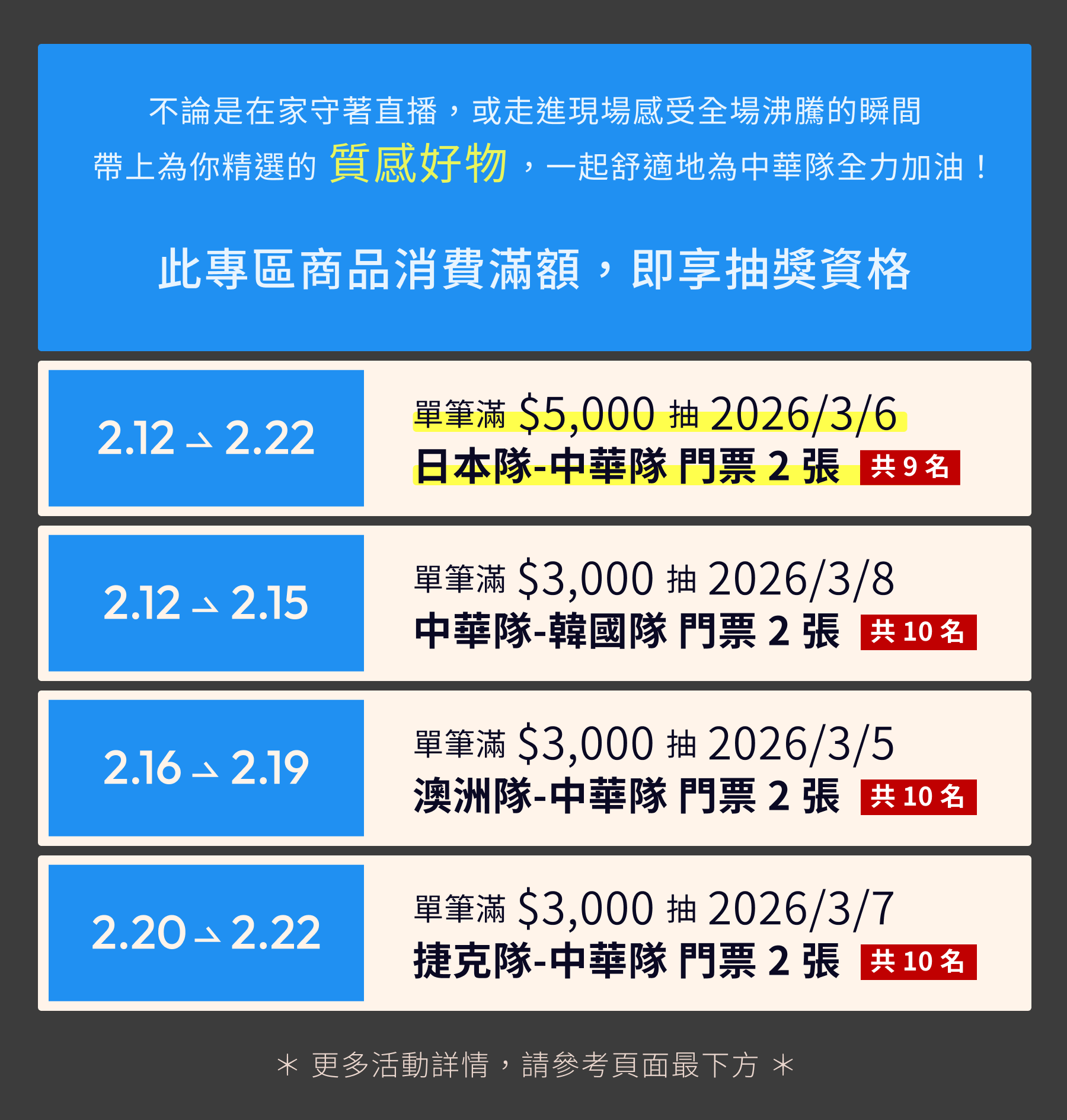 2/16 - 2/19 期間專區商品單筆消費金額達新台幣 3,000 元(含)以上,即享抽 2026/3/5 澳洲隊-中華隊 門票兩張之資格乙次。