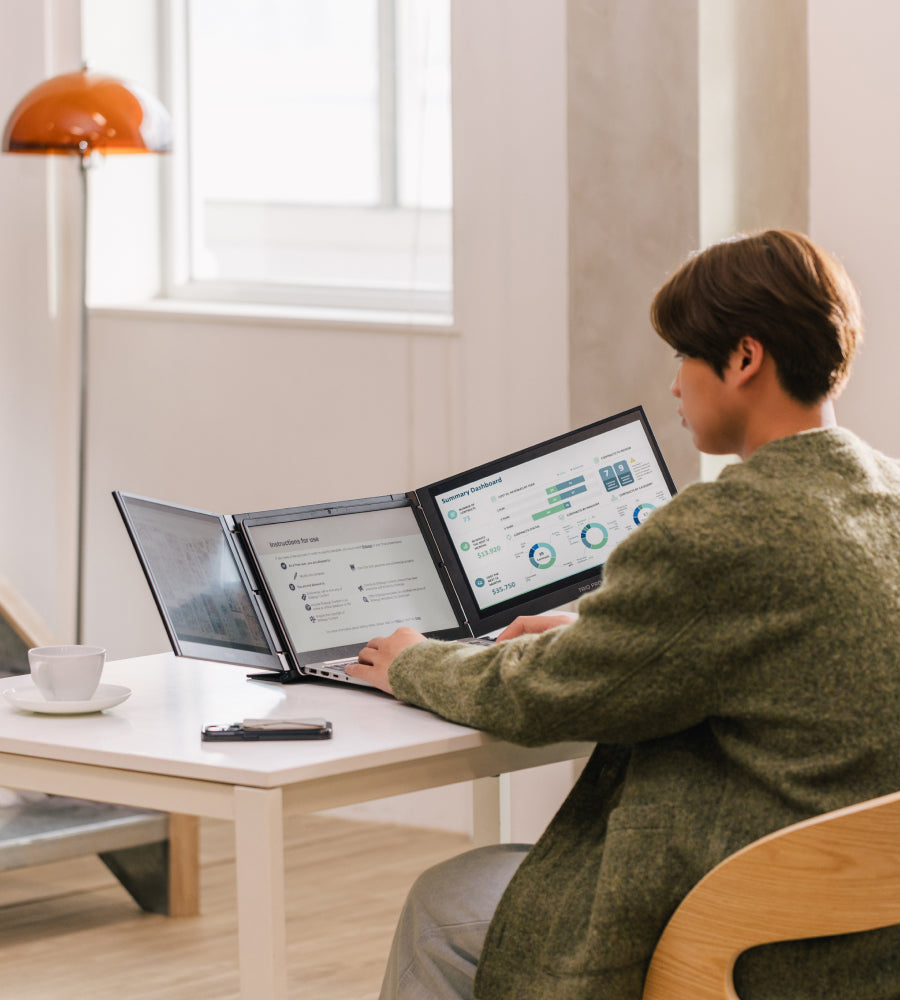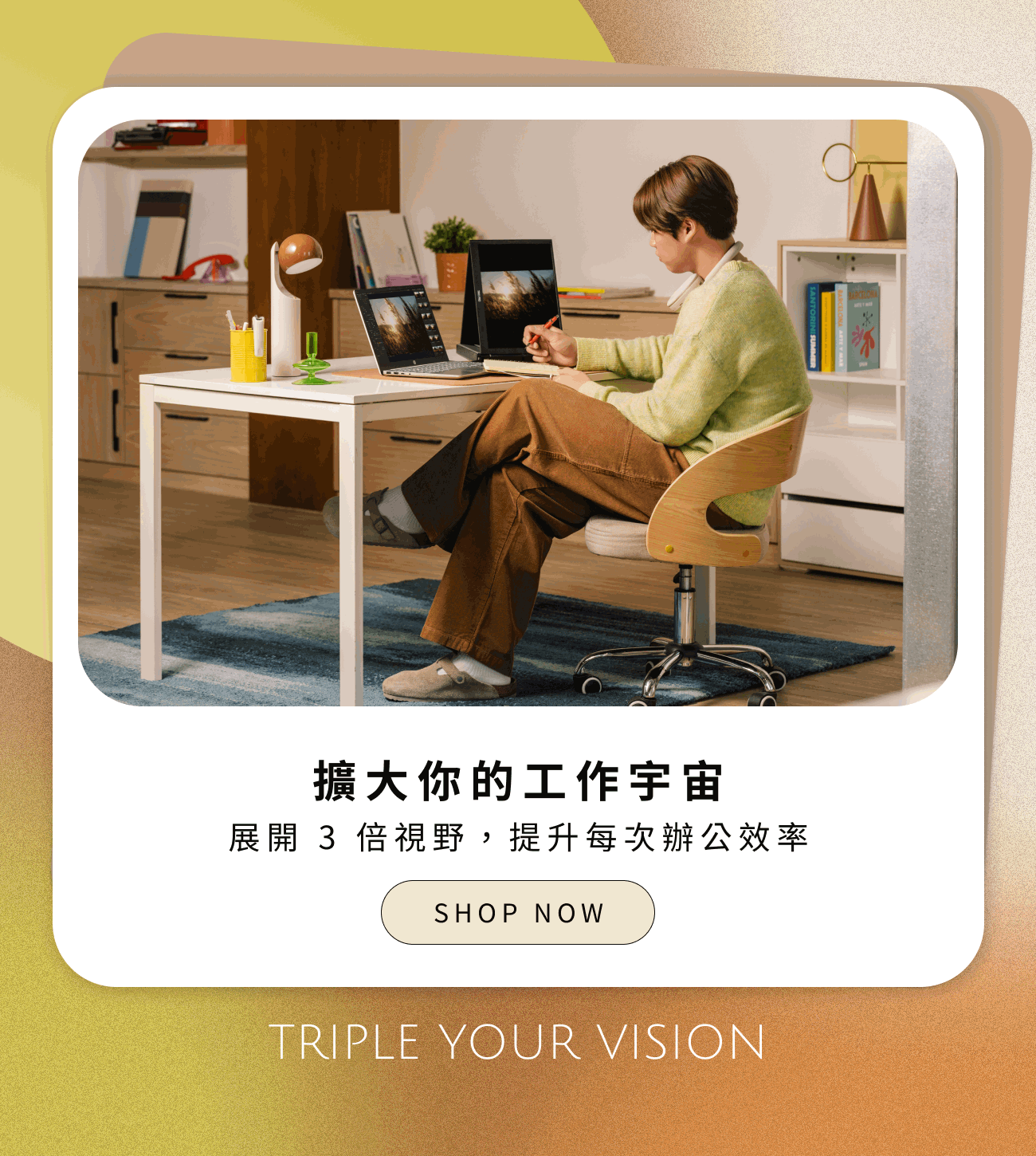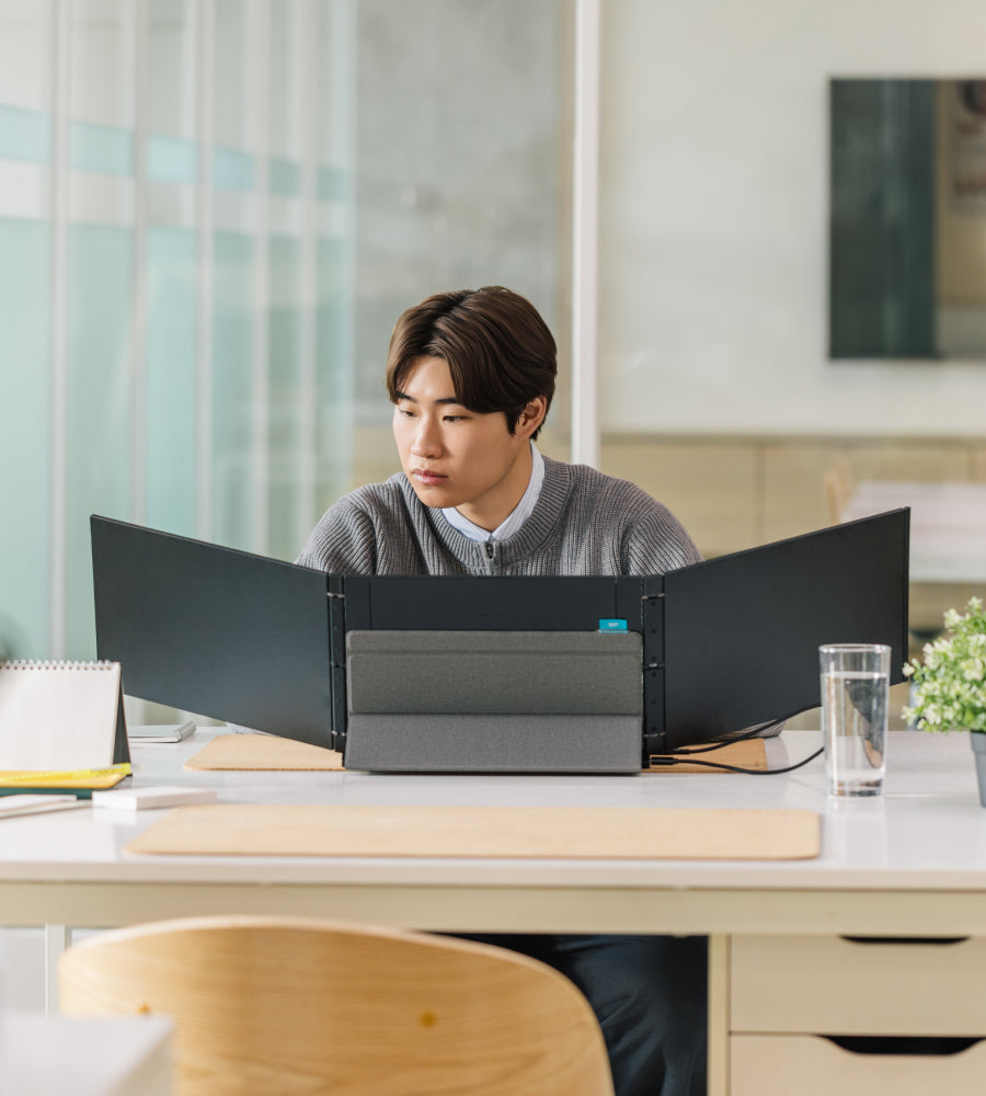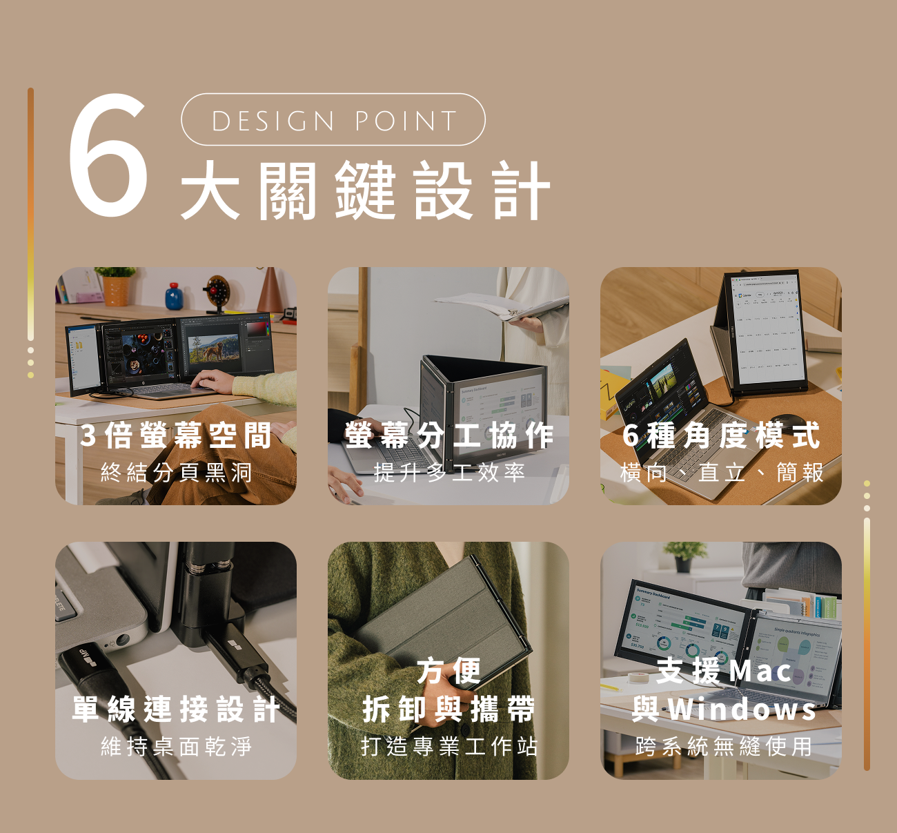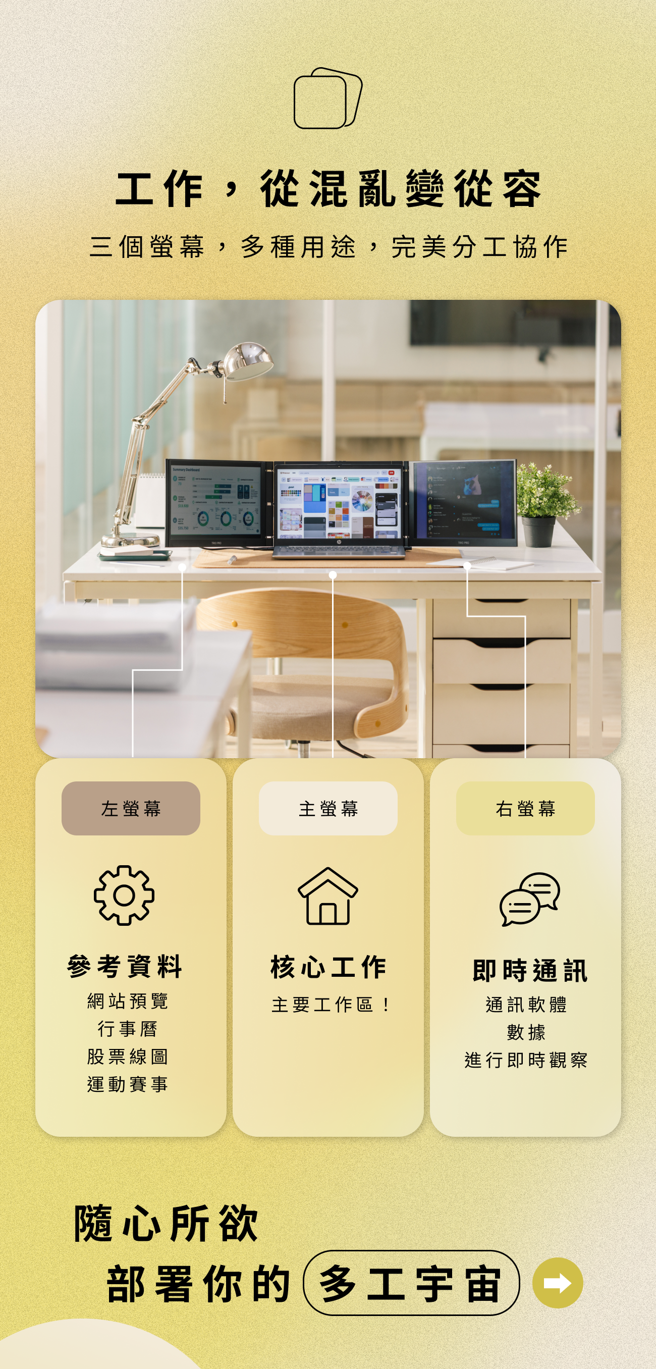 由創辦人 Jack 與 Stephen 在多年職場經驗中誕生。當時他們被單螢幕限制、不停切換視窗的日子,為了改善效率與身心壓力,他以設計專業為起點,著手打造能真正提升使用者工作體驗的行動多螢幕解決方案