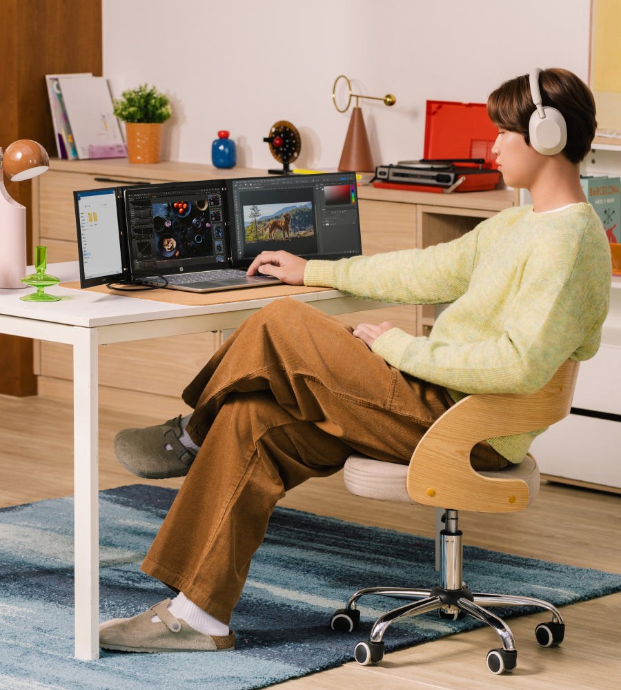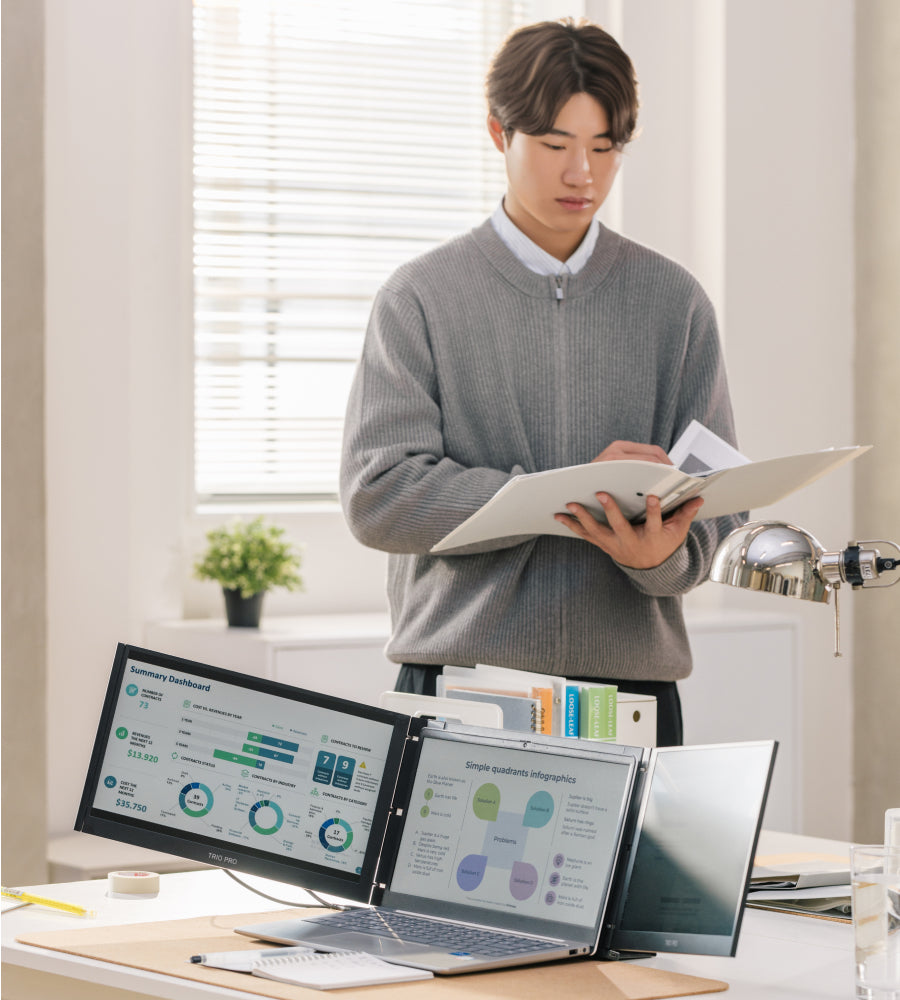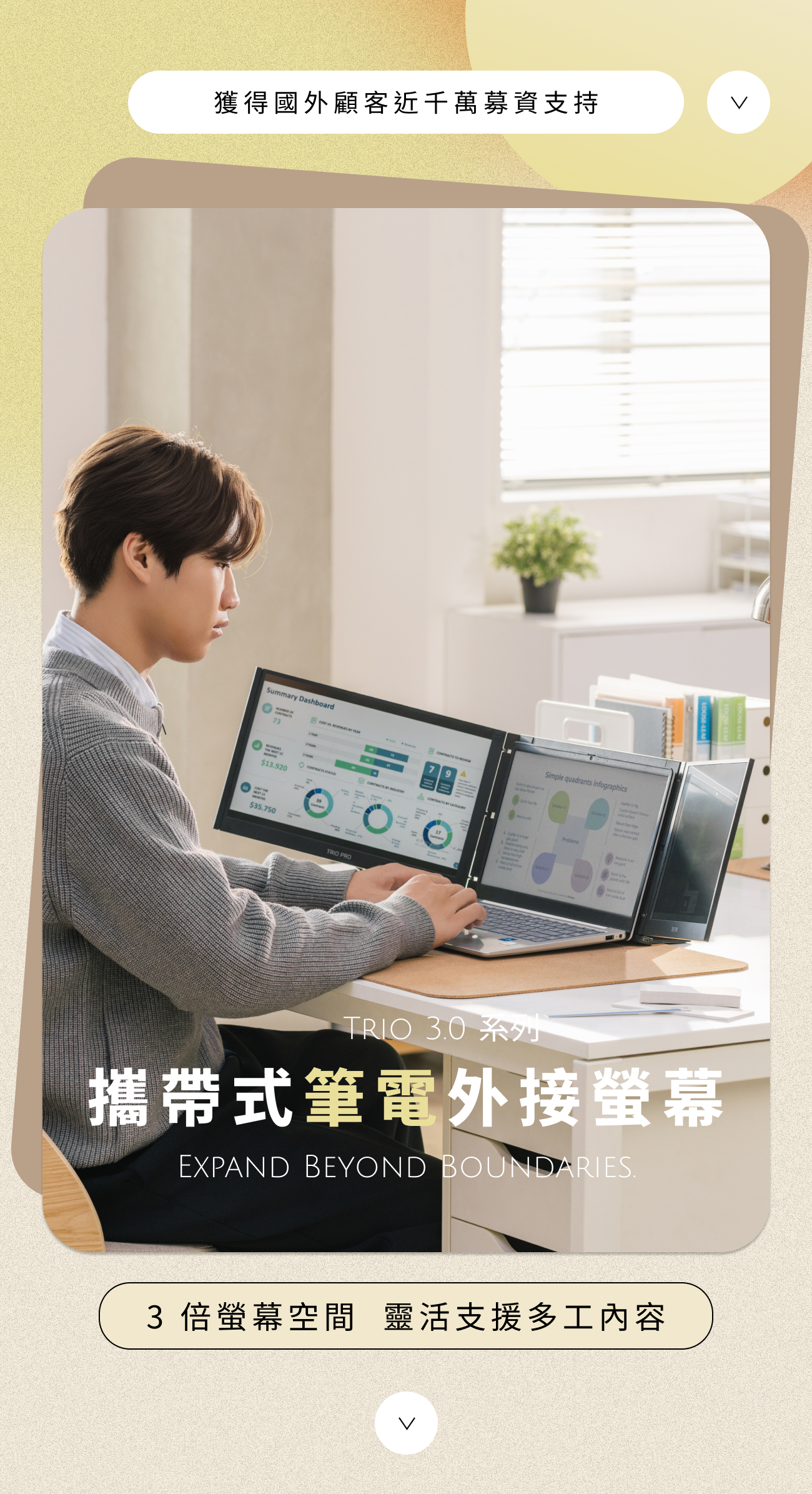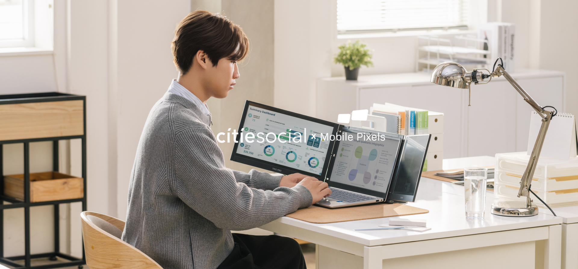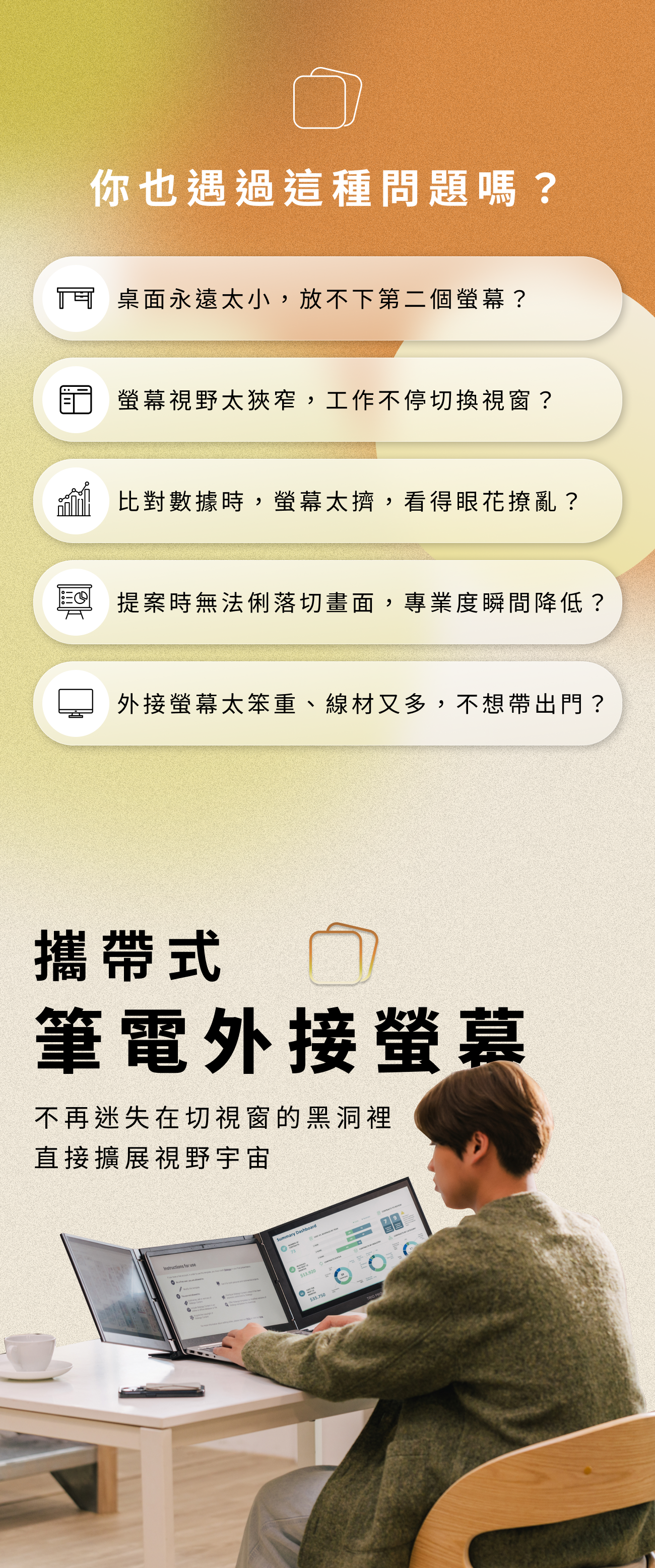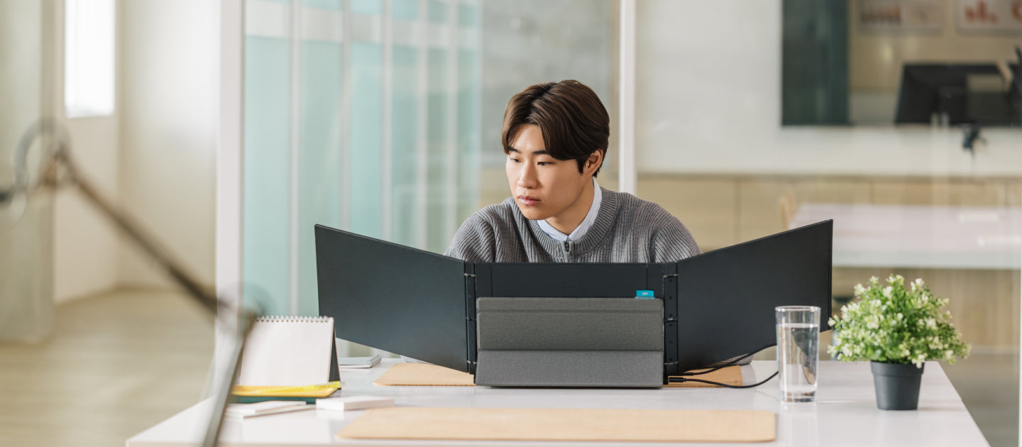 由創辦人 Jack 與 Stephen 在多年職場經驗中誕生。當時他們被單螢幕限制、不停切換視窗的日子,為了改善效率與身心壓力,他以設計專業為起點,著手打造能真正提升使用者工作體驗的行動多螢幕解決方案